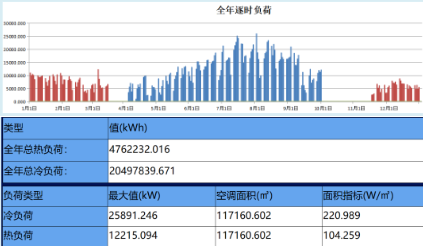 工程制冷期为5.1~9.30,采暖期为11.15~3.15,按照采暖期和制冷期工作日计划表计算逐时冷热负荷,通过全年负荷计算柱状图,直观查看全年负荷的计算情况。