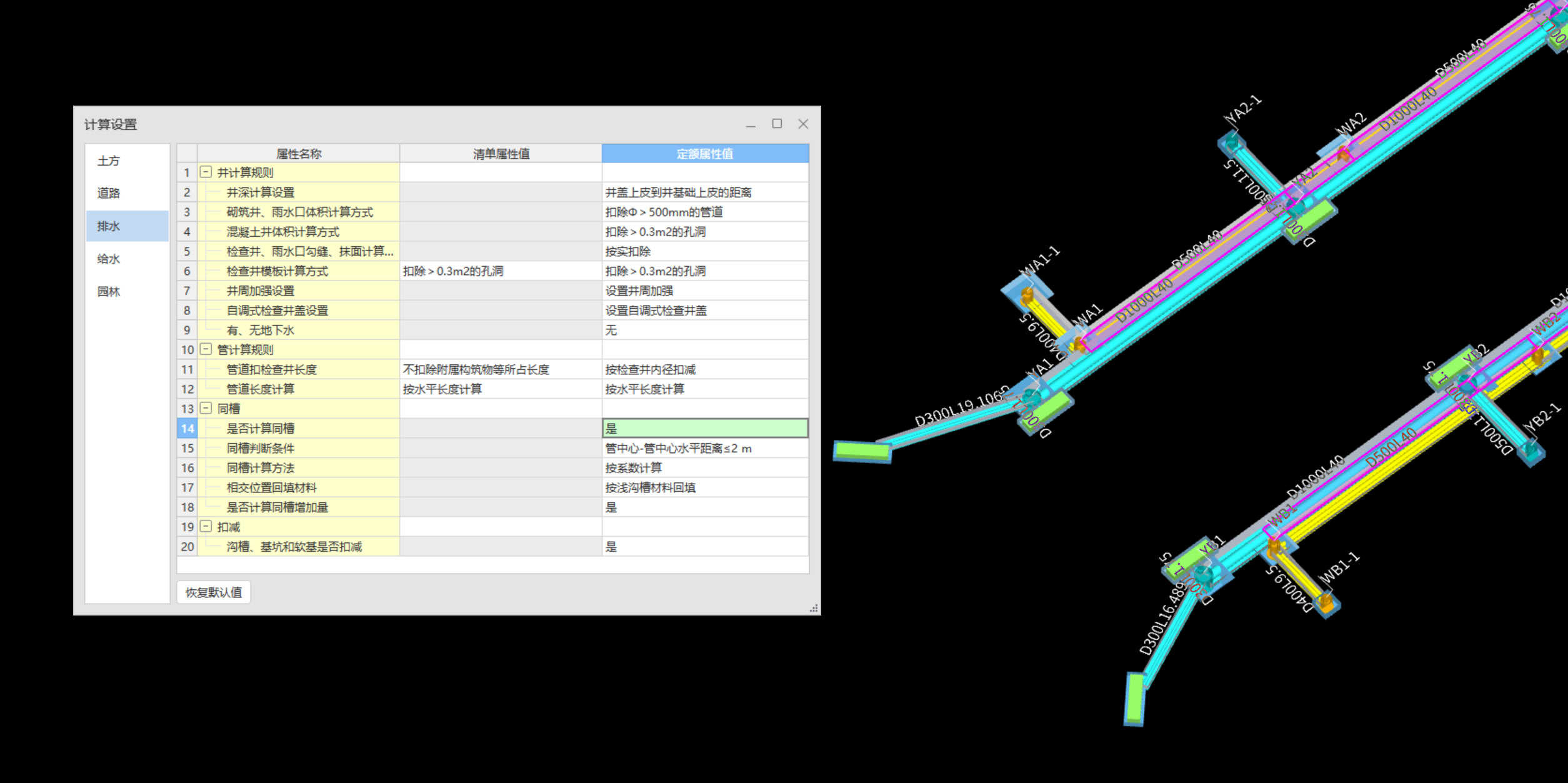 软件根据设置的计算规则自动判断是否为同槽土方,精确考虑土方扣减。