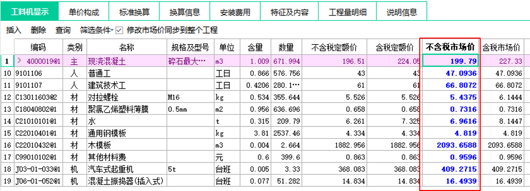 项目信息中,选择价格水平调整文件,工料机市场价自动加载。