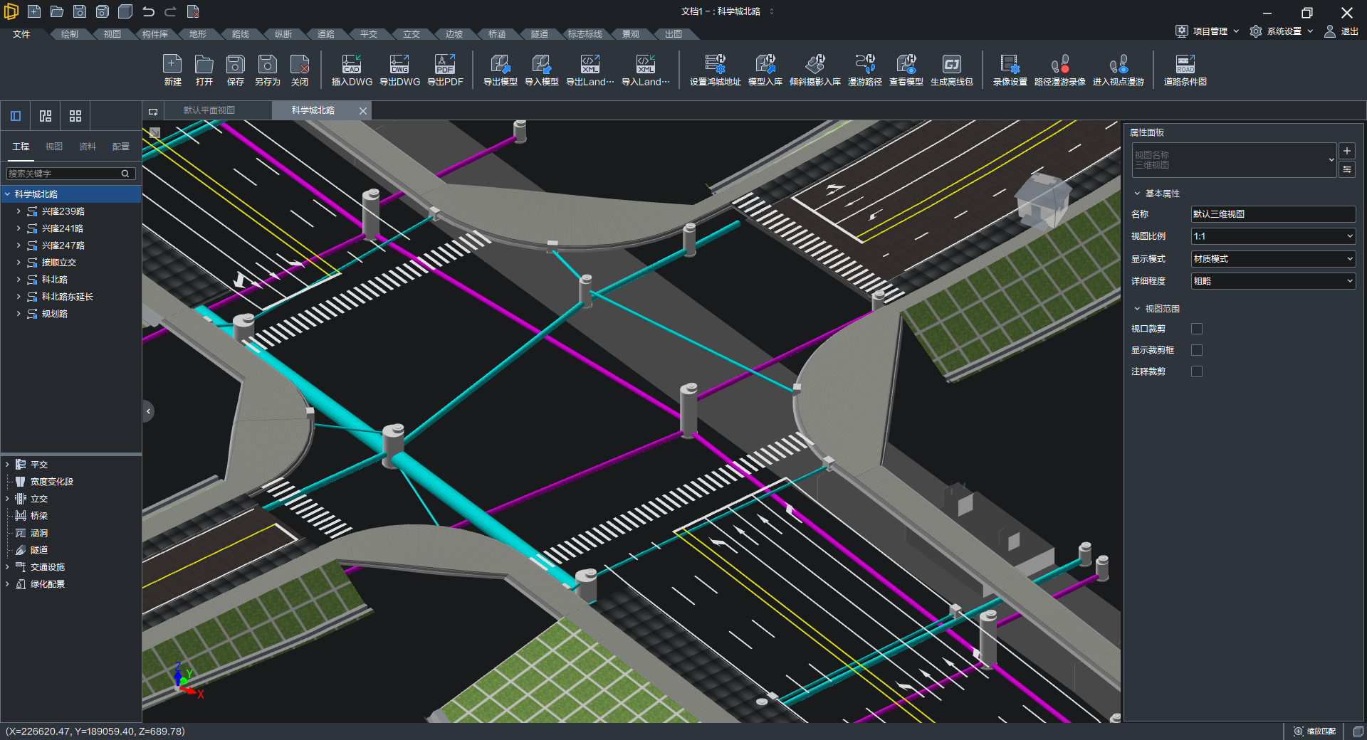 高逼真度渲染通过软件内置的渲染器FalconV实现高画质动画或效果图渲染,绿化树、路灯、车辆模型等自动替换为对应的精模,设计模型变更后同步更新到FalconV,无3D美工基础要求 |