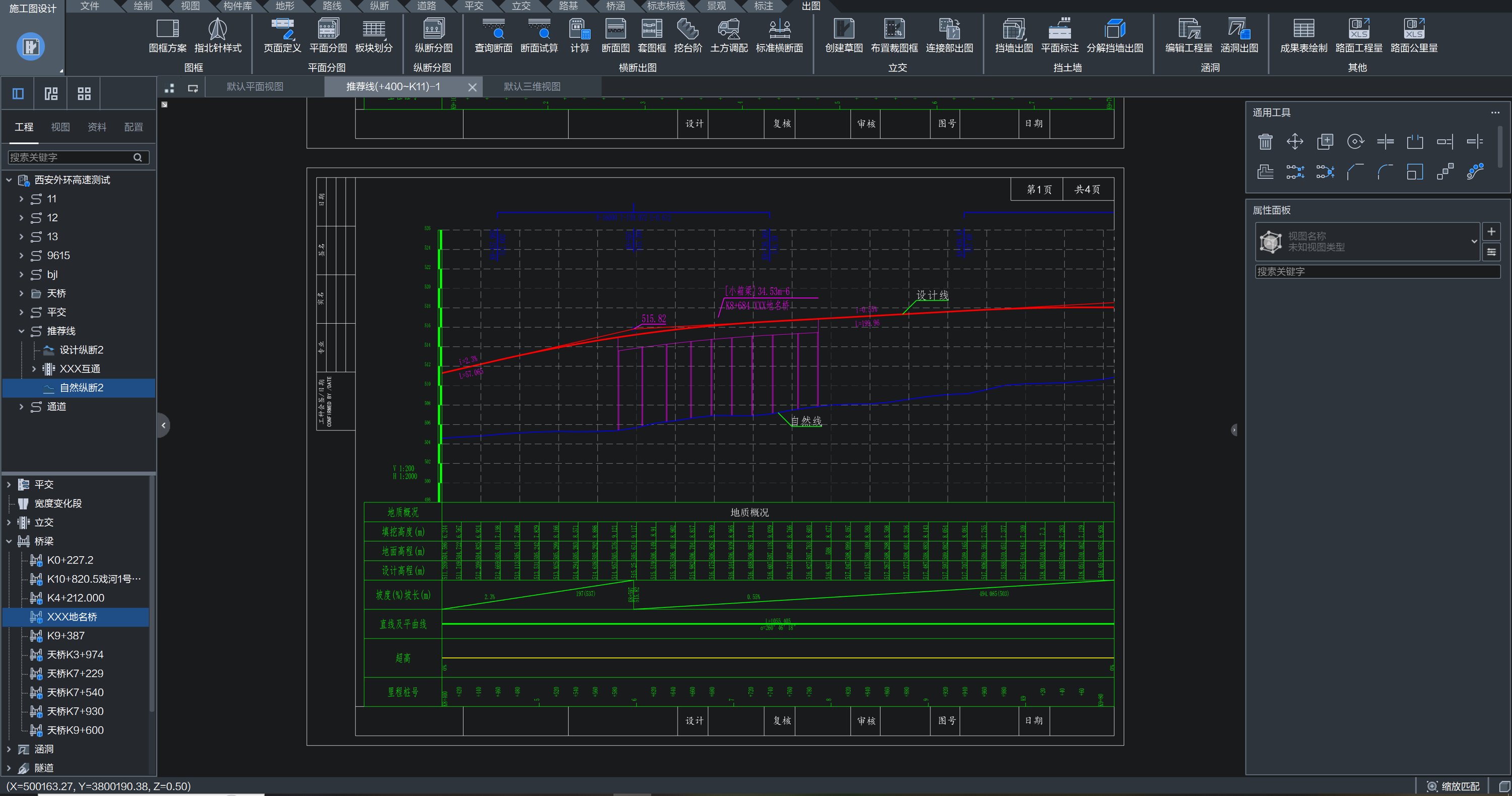 纵断设计自然纵断包括新建自然纵断、从地形提取自然纵断、从文件导入自然纵断;设计纵断包括新建设计纵断、从文件导入设计纵断,支持双视图拉坡;拉坡方式包括自由拉坡、定桩号、定高程、定前坡、定后坡,反算竖曲线半径、反算变坡点高程 |