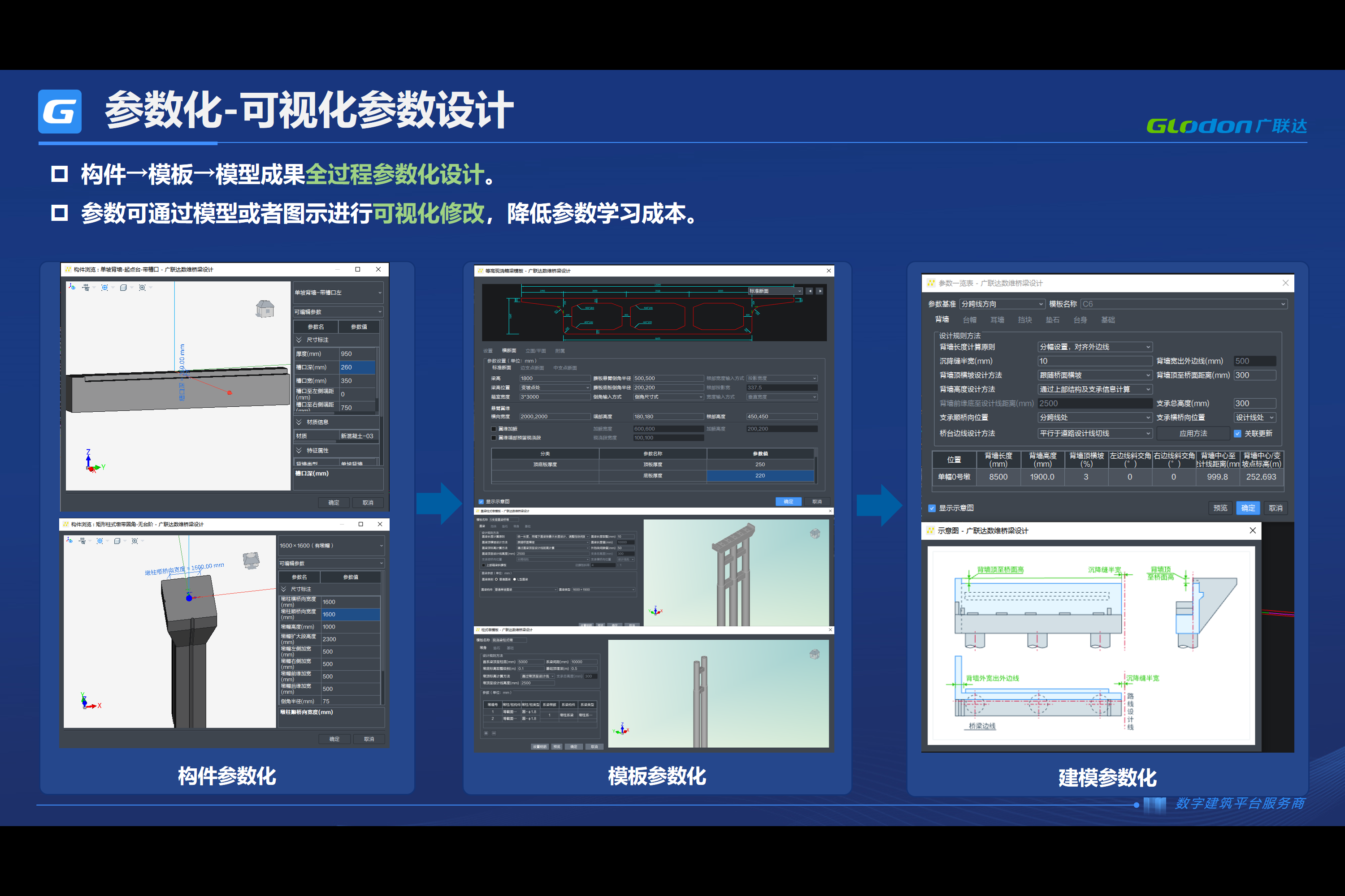 参数化-可视化参数设计1、程序采用参数化设计的界面,从构件到模板,然后再到模型布置,全过程参数化设计。 2、参数可通过模型或者图示进行可视化修改,如背墙的槽口深度、宽度,桥墩参数,参数修改同时配以三维预览图;现浇箱梁设置参数多达200个,程序提供可视化参数设计界面配以相应的示意图,在输入模板中进行横断面参数输入断面图会实时显示横断图图形位置,非常方便用户来上手学习降低参数学习成本。 |