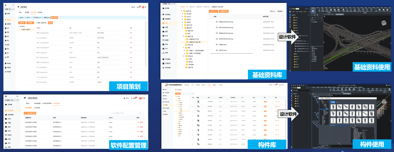 项目策划:项目负责人/专业负责人通过线上的方式组建项目团队,进行任务分配、项目资料管理等,实现项目精细化管理。 基础资料库、构件库:根据项目要求,从构件库、基础资料库中选择所需要的数据,这些数据在设计软件中直接调取使用。 统一软件配置:使用协同软件对道路、桥梁、管线等专业配置进行统一管理(如出图样式、设计规则、规格库等),并同步到设计软件中。