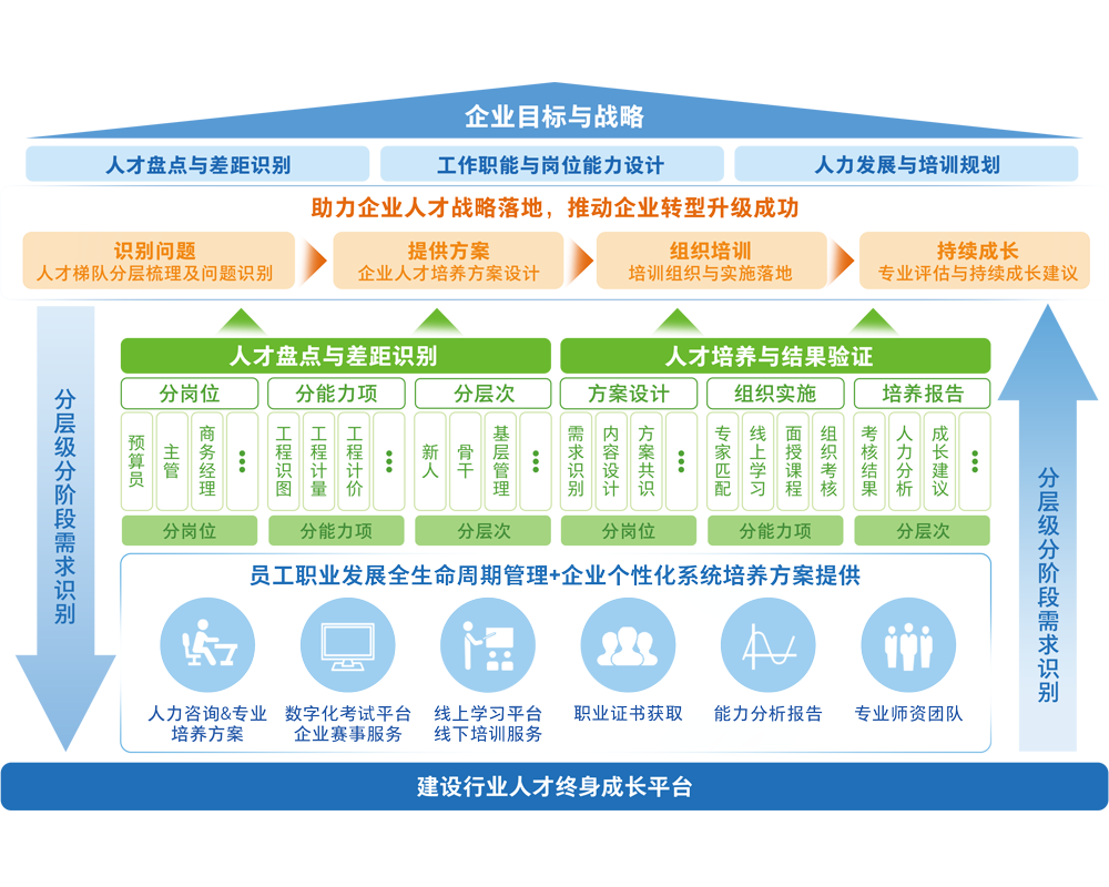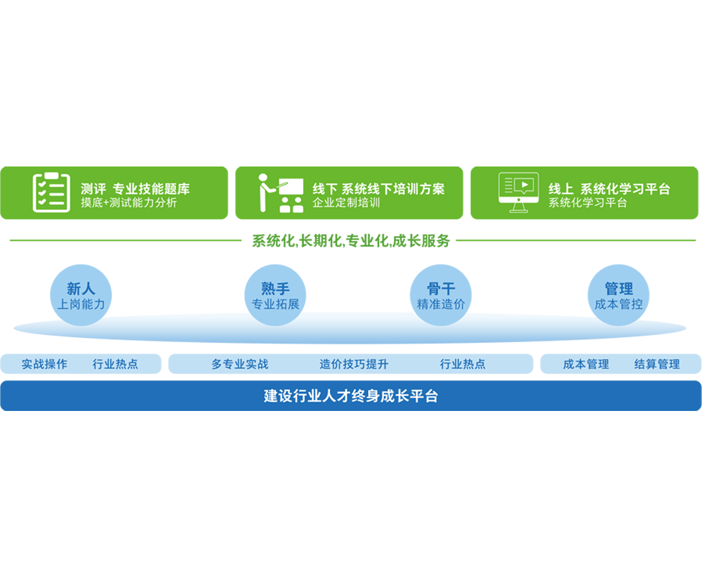 致力于为建筑行业客户提供以专业能力提升为核心的一体化人才培养解决方案,聚焦关键岗位能力提升。 基于行业痛点,结合企业特点,按阶段匹配客户需求、按业务模块设计课程产品,通过数字化学习平台、专业化内容供应、高质量运营服务的组合, 为企业提供“学、练、测、评、踪”一体的线上+线下数字化人才培训方案,帮助企业全层级人员能力提升,推动组织升级。