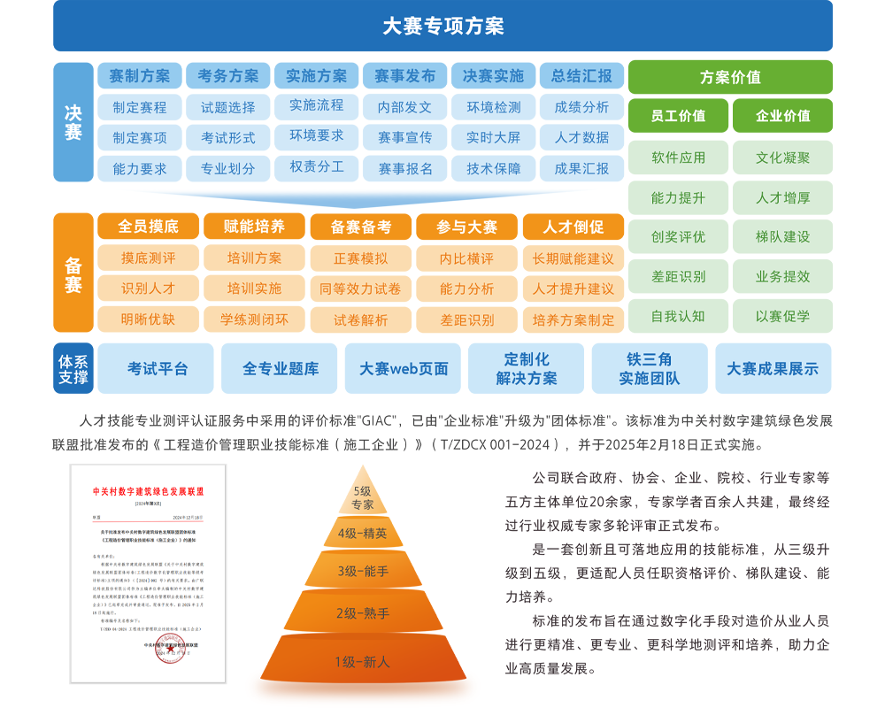 8868体育官网登录入口为客户提供人才技能专业测评认证服务,其中大赛服务旨在为企业提供全过程、全方位、全成长周期的大赛专项方案,帮助企业高效、公正地完成赛事执行,节约人力投入。通过大赛及员工备赛,企业可全面了解员工能力,完善人才档案与梯队建设;通过创奖评优,发掘优秀人才树立标杆,以赛促学,提升团队整体能力,促进企业精细化人才管理,助力降本增效。