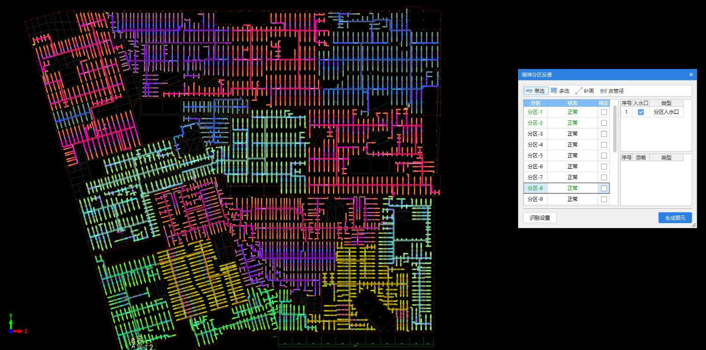 一次性可以将整张图纸的喷淋管道自动识别完成,并且自动生成沟槽连接件