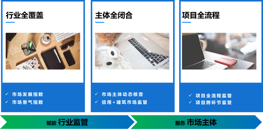 对相关处室“数据化赋能”,实现业务的协同监管。主要包括:行业发展综合监管、市场主体闭合监管、工程项目全过程监管。
