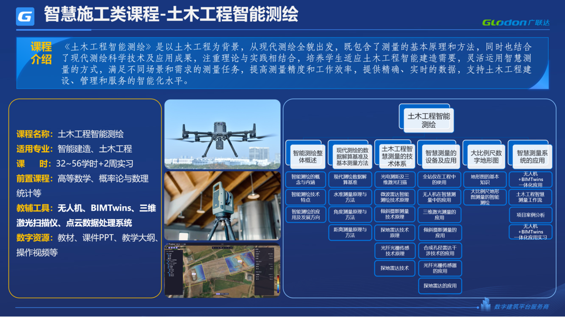 《土木工程智能测绘》课程让学生掌握三维激光扫描、倾斜摄像、探地雷达等先进测量技术和装备的使用方法及方案规划的能力,了解智能测绘的整个理论体系及底层原理,同时辅助行业智能测绘平台,培养学生智能测绘的综合实践能力。