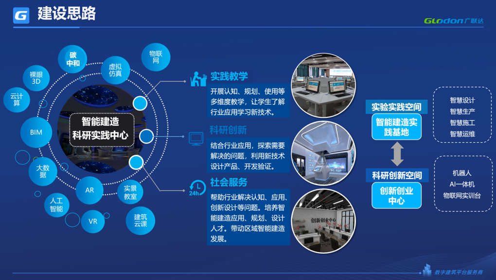 在科研实践基地建设方面,我们秉承实践教学、科研创新、社会服务一体化的原则,聚焦实验实践空间、创新创业中心建设,可以贯穿建筑全生命周期和教学科研一体化。